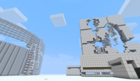 New players to the world spawned at the central structure, which consisted of a large room made of iron and glowstone, with a diamond block pad to serve as the spawn area, and a portal to the Nether. Players that left the building would see that the outside of the structure looked much like an abstract work of art, looking like a rubix cube of iron that has been dissolved partially. Next to this building lay an impressively large arena, also mainly built with iron. This arena was the only place on the world where the Void could be accessed. Anyone who didn't have /god on would die very quickly after falling in. The world also featured a myriad of other structures that various players had built.
