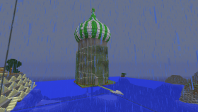 It has 4 floors, each with a different challenge (but none too challenging). You are invited to try to get the best time to run through the tower. The start point is on the arrow head shaped island that extends out into the water (where you will also find an ender chest to drop your valuables).