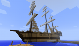 The ship features an impressive length of 69 meters from bow to stern, and has masts that almost literally scrape the sky. The masts themselves are all climbable, and are held in place by arching wooden fence-work. There are many cannons on the ship, which would make it a force to contend with, if it could actually be made to move.